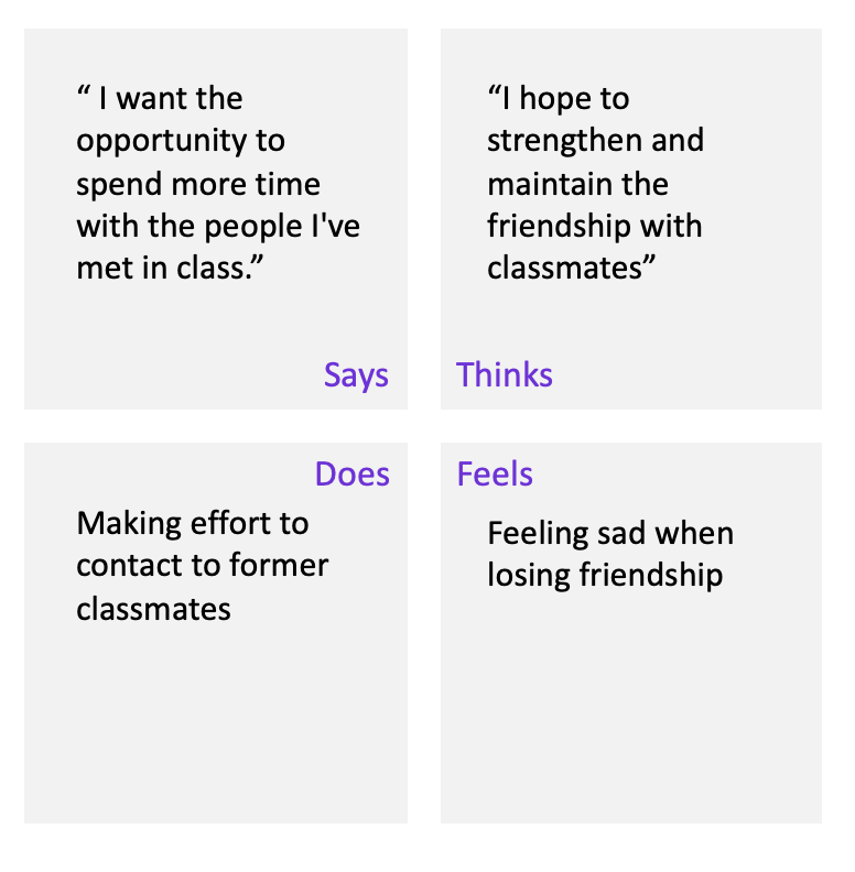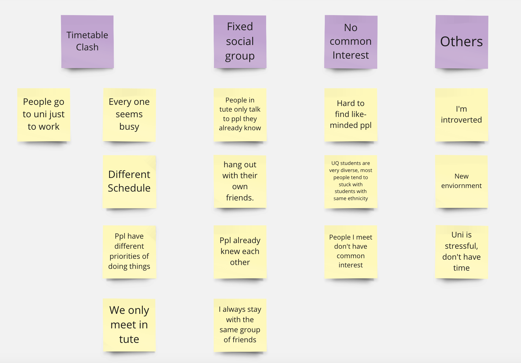 From 7 casual interviews and 40 survey responses, we learned that most students do have attempted to connect with their peers. However, students found it hard to get adequate friendships because: