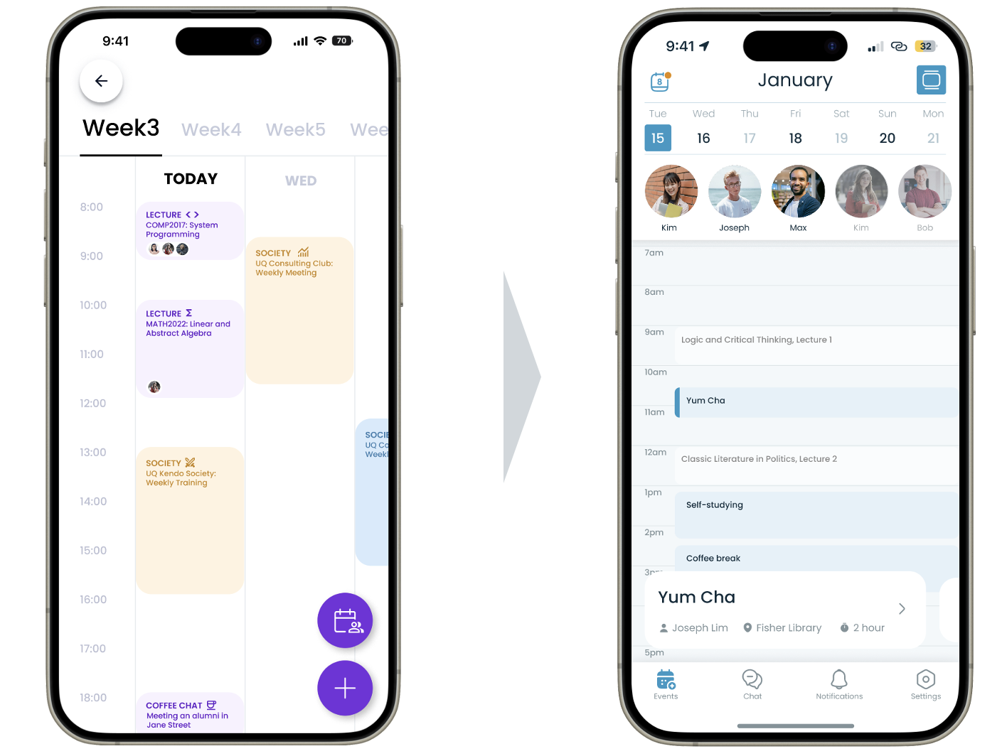 Before: Users have to click on the sharing timetable button from the timetable page and select a friend to see available time slots.